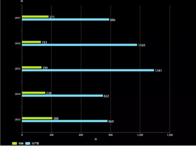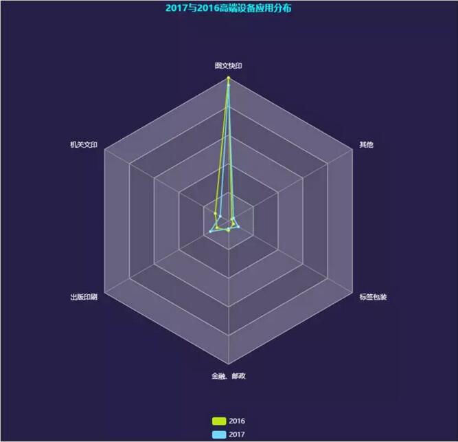 到2017年7月,單張紙高端彩色數(shù)字印刷設(shè)備(圖中綠柱)裝機總量達(dá)到2096臺,在上年度的基礎(chǔ)上增加了271臺,增長率接近15%,比上年度的增長率增長了3個百分點,是近三年中新增量最高的一年。